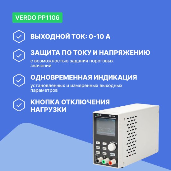 Источник питания VERDO PP1106 программируемый лабораторный имеет импульсную схемотехнику, благодаря чему при компактном размере и небольшой цене обеспечивают выходное напряжение до 60 В, ток до 10 А и мощностью до 300 Вт.