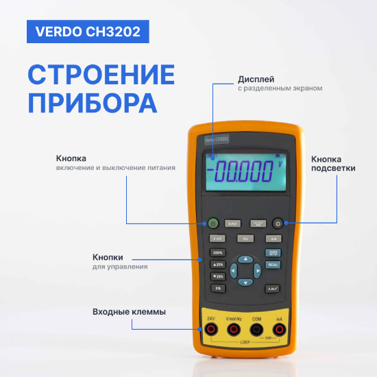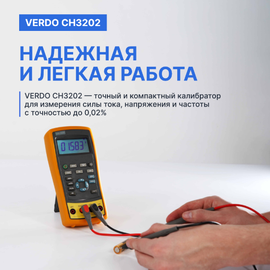 Профессиональные портативные калибраторы VERDO CH3202 — это калибраторы тока, напряжения и частоты с функцией измерения, незаменимый прибор для сервиса, настройки, калибровки и ремонта удаленных объектов промышленной автоматики и контрольно-измерительных систем. Высокая точность прибора (до 0,02%) при измерении и генерации напряжения, сигналов токовой петли, частотных приводов, плюс батарейное питание и небольшой вес делают прибор незаменимым инструментом мобильных сервисных служб, обслуживающие важные промышленные предприятия и агрегаты. VERDO CH3202 вполне заменит популярный калибратор токовой петли Fluke 715, ушедший с рынка РФ.