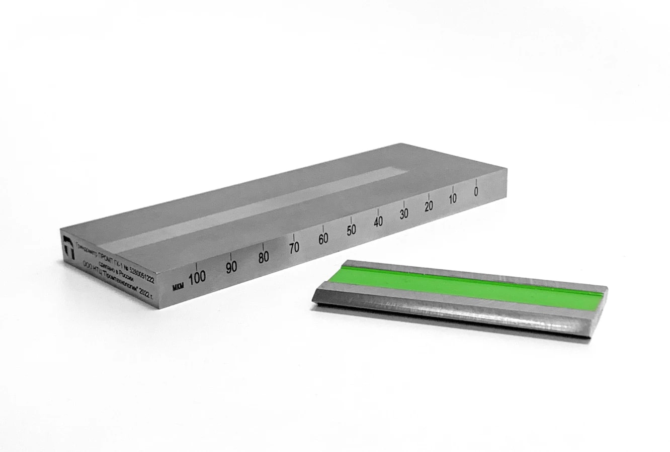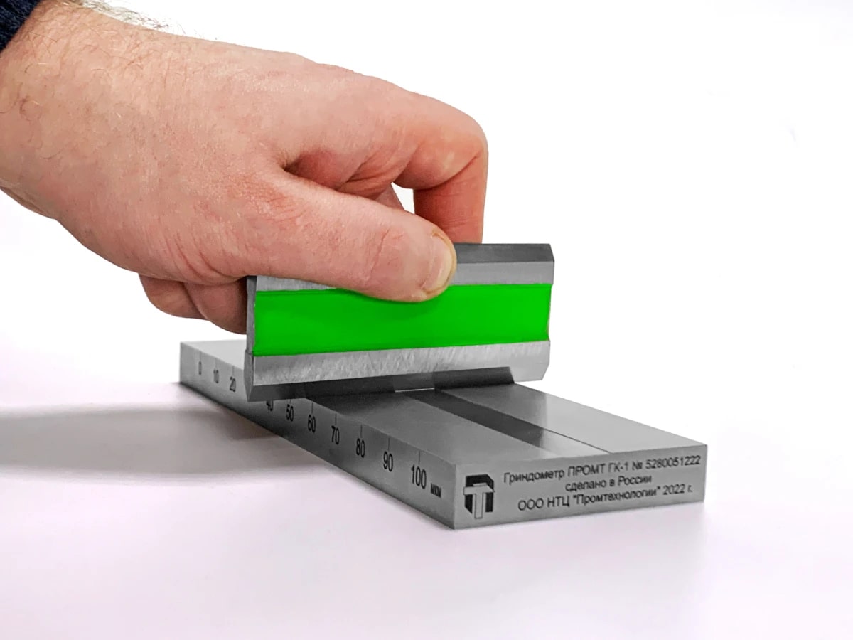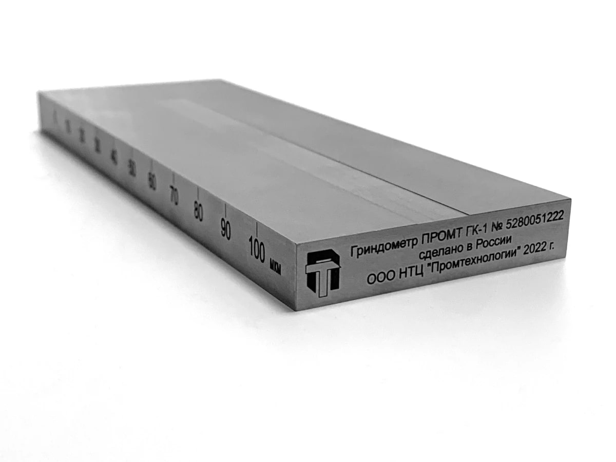 Гриндометр ПРОМТ ГК-1 (0-100 мкм) используется для контроля степени перетира пигментированных лакокрасочных материалов, диспергированных пигментов и наполнителей по ГОСТ 31973-2013, ISO 1524. В основу метода положено распределение испытываемого материала в клинообразном пазе прибора специальным скребком. Результатом измерения является значение глубины паза в мкм на котором будет визуальным способом зафиксировано появление штрихов или видимых частиц материала. Температура является важным параметром при проведении испытания и определяется ГОСТ либо нормативными документами на контролируемую жидкость. Представляет из себя модифицированную версию гриндометра NOVOTEST ГК-1.
