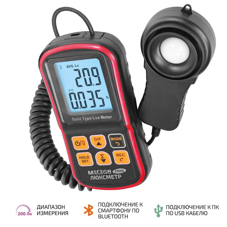 МЕГЕОН 21005 – это цифровой измеритель освещённости с высокими техническими показателями и большим набором возможностей. Модель представляет собой измерительный прибор для определения интенсивности света во многих местах: заводы, школы, офисы, транспорт и дома. Может успешно применяться в обучении, науке, а также при разработке и изготовлении различного светогенерирующего оборудования и осветительных приборов. Выполнен в прочном эргономичном корпусе с выносным датчиком, что в свою очередь благоприятно влияет на удобство эксплуатации. Память изделия вмешает до 2000 записей сохранённых в автоматическом режиме и 60 в ручном. Программное обеспечение позволяют передавать измерения при помощи функции Bluetooth в мобильные устройства на базе Android, а также переносить полученные данные на персональный компьютер с целью их дальнейшей обработки.