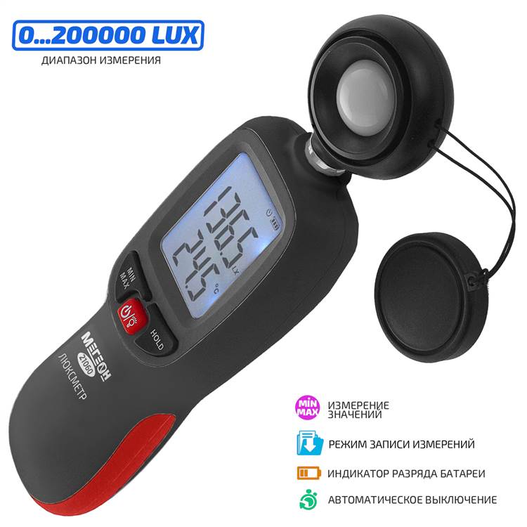 МЕГЕОН 21060 - новинка в модельном ряду цифровых люксметров. Представленный прибор предназначен для быстрого определения параметров освещённости с высокой точностью в производственных помещениях, в школах и офисах. Модель имеет эргономичную форму корпуса и удобное расположение органов управления, благодаря чему достигается максимальное удобство при эксплуатации. Измерить даёт возможность измерять показатели света в пределах 0 ... 200000 люкс. Прекрасно подходит для применения в научных сферах, обучении, промышленности при разработке светоизлучающего оборудования, а также осветительных приборов. Станет незаменимым помощником при аттестации рабочих мест с возможностью замера дифференциальных, максимальных и минимальных значений. Все элементы управления находятся на передней панели, а на задней стенке расположено универсальное крепление для штатива. Изделие по достоинству оценят любители и профессионалы.