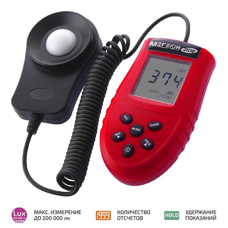 Представляем Вашему вниманию новинку от торговой марки МЕГЕОН - портативный измеритель освещенности МЕГЕОН 21170 с выносным фотодатчиком. Его приобретение ознаменует собой шаг вперед в области точных измерений. Новинка отличается высокой надежностью и точностью, а также неприхотливостью к условиям эксплуатации. Прибор МЕГЕОН 21170 имеет широкий рабочий диапазон с функцией автоматической подстройки, который существенно упрощает проведение измерений. При необходимости, пользователь может вручную установить необходимый интервал измерений. Быстрый отклик, мгновенный результат измерения. Помимо измерения минимумов и максимумов люксметр обладает очень удобной функцией записи результатов измерений в память прибора. Представленный прибор отлично подойдет для измерения энергии видимого света в различных помещениях и зданиях.