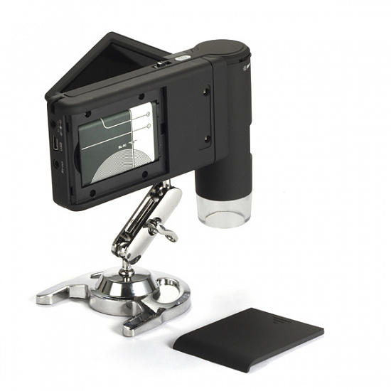 За счет откидной конструкции дисплея, в сложенном положении микроскоп Levenhuk DTX 500 Mobi занимает мало места, легко умещаясь в кармане. Прибор можно фиксировать в неподвижном положении с помощью комплектного штатива. Наличие встроенных светодиодов позволяет работать без внешней подсветки, обеспечивая комфортное освещение обследуемого объекта без теплового влияния на него. Для работы без подключения к ПК, помимо собственного дисплея и аккумулятора, цифровой микроскоп оборудуется сетевым адаптером, видеовыходом и кабелем для передачи видеосигнала на телевизор.