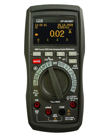 Модель DT-9519BT способна проводить измерения постоянного и переменного напряжения одновременно (ACV+DCV), за счет чего получает точные результаты в работе с выпрямительными контурами. Отдельно выделена функция для диагностики силы тока большого номинала (до 3000 А). При использовании вблизи силовых кабелей выдает четкие результаты с минимальной погрешностью благодаря функции Low Z, минует скачки напряжения в токопроводящей линии для получения достоверной фактической цифры. Традиционно измеряет MAX, MIN и средние значения.