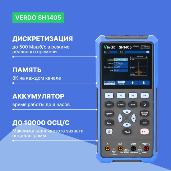 Портативный осциллограф ручной VERDO SH1405 это комбинация в одном компактном корпусе двухканального цифрового осциллографа с полосой до 100 МГц и 4½- разрядного TrueRMS мультиметра.