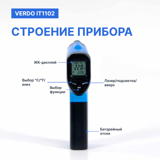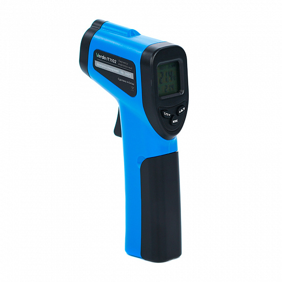 Инфракрасные пирометры Verdo IT1102 — это современные измерительные инструменты, предназначенные для бесконтактного определения температуры поверхностей. Они работают на основе измерения инфракрасного излучения объекта и преобразования его в электрический сигнал, который пропорционален температуре.