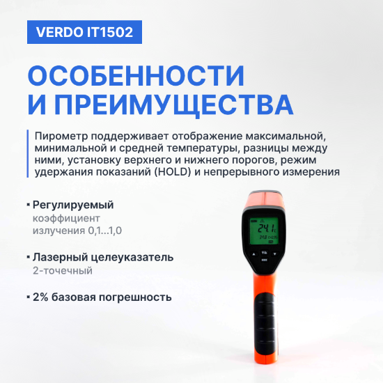 Инфракрасный пирометр Verdo IT1502 — это высокотехнологичный прибор для бесконтактного измерения температуры поверхностей. Он работает на основе измерения инфракрасного излучения объекта и преобразования его в электрический сигнал, пропорциональный температуре.