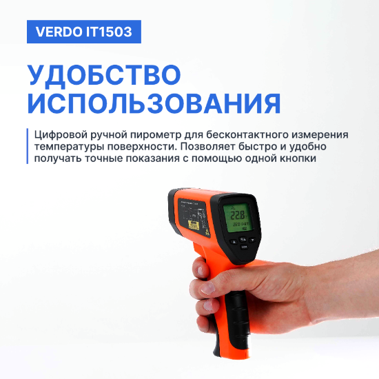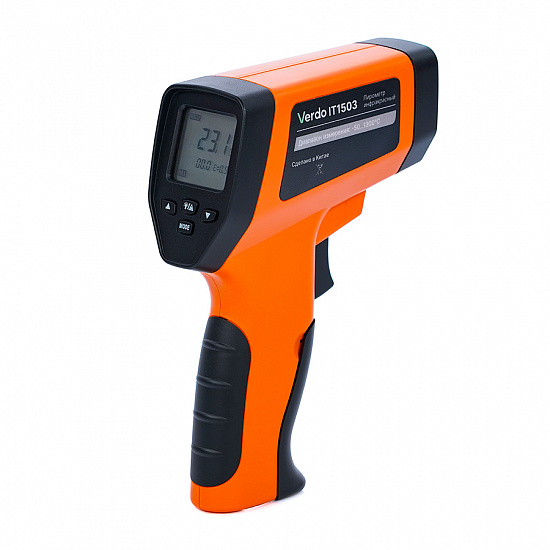 Пирометры инфракрасные Verdo IT1503 предназначен для бесконтактного измерения температуры поверхностей твёрдых тел, газовых струй и расплавов различных материалов. Работает на основе преобразования потока инфракрасного излучения исследуемого объекта через оптическую систему и инфракрасный фильтр на фотоэлектрический приёмник. Затем сигнал преобразуется внутренней микропроцессорной системой в цифровой сигнал. Пирометр изготовлен в пластиковом корпусе с инфракрасным датчиком, лазерным целеуказателем и кнопкой для измерения температуры и включения пирометра. На лицевой стороне расположены жидкокристаллический дисплей и кнопки управления. Микропроцессорная система пирометров обеспечивает обработку результатов измерений и индикацию текущего значения температуры объекта на дисплее.