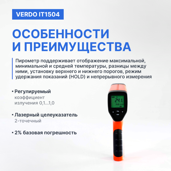 Инфракрасный пирометр Verdo IT1504 бесконтактный измерительный прибор, предназначенный для быстрого и точного определения температуры поверхности различных объектов. Он использует инфракрасную технологию для обнаружения и анализа инфракрасного излучения, испускаемого объектом, и преобразует его в электрические сигналы для отображения температуры на цифровом дисплее. Прибор оснащен жидкокристаллическим дисплеем с подсветкой, позволяющим считывать показания в условиях различной освещенности. Применение инфракрасного пирометра целесообразно в различных отраслях промышленности, включая металлургию, машиностроение, энергетику и HVAC-системы. Прибор также находит широкое применение в лабораторных исследованиях, строительстве и коммунальном хозяйстве.