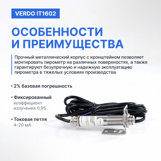 Инфракрасный стационарный пирометр Verdo IT1602 состоит из инфракрасного датчика, оптической системы и электронной схемы преобразования, заключённых в корпус из нержавеющей стали. Этот прибор предназначен для бесконтактного измерения температуры различных объектов с помощью инфракрасного излучения.