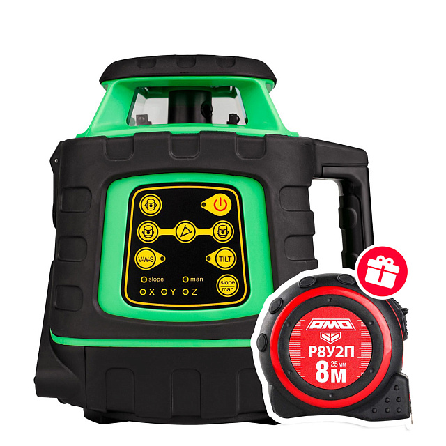 Ротационный лазерный нивелир AMO ROTOR 300G проецирует вертикальную и горизонтальную плоскости с разверткой на 360°. Прибор позволяет с высокой точностью проводить выравнивание дорожного полотна, выполнять разметку во время таких строительных работ, как заливка полов, возведение стен и фундаментов. Дальность работы составляет 600 м. Нивелир имеет яркий лазер зеленого цвета, который отлично видно при работе как внутри, так и снаружи помещения. Лазерный уровень работает от четырех щелочных батареек или перезаряжаемого аккумулятора.