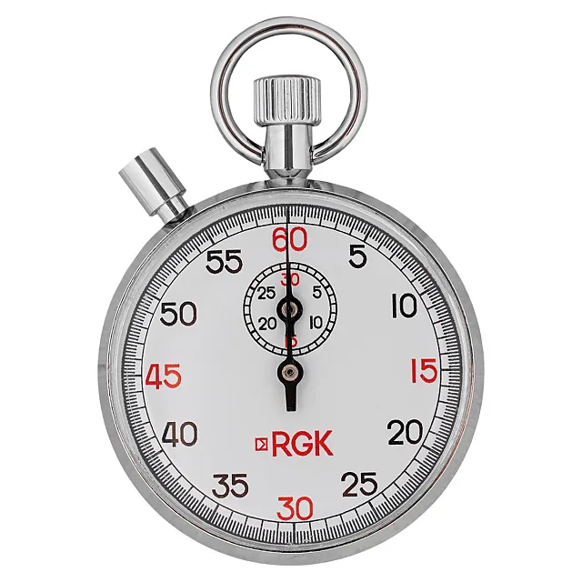 Прибор выполнен в корпусе диаметром 50 мм скругленной формы. Устройство удобно помещается в руку, позволяя выполнять все необходимые манипуляции в процессе измерений одной рукой. Считывание показаний в секундах производится с основного циферблата, а в минутах – с дополнительной круговой шкалы с отдельной стрелкой меньшего размера. Запуск и останов часового механизма производится с помощью анкерной системы, которая приводится в действие при нажатии на заводную головку, размещенную в верхней части механического секундомера RGK SWM-2B6. Для сброса измерителя, с автоматической установкой стрелок в нулевое положение, служит отдельная кнопка. Элементы механизма изготовлены из нержавеющей стали, а приводная пружина – из никелевого сплава. Для минимизации износа вследствие истирания изделие снабжено 13 камнями из синтетического рубина.