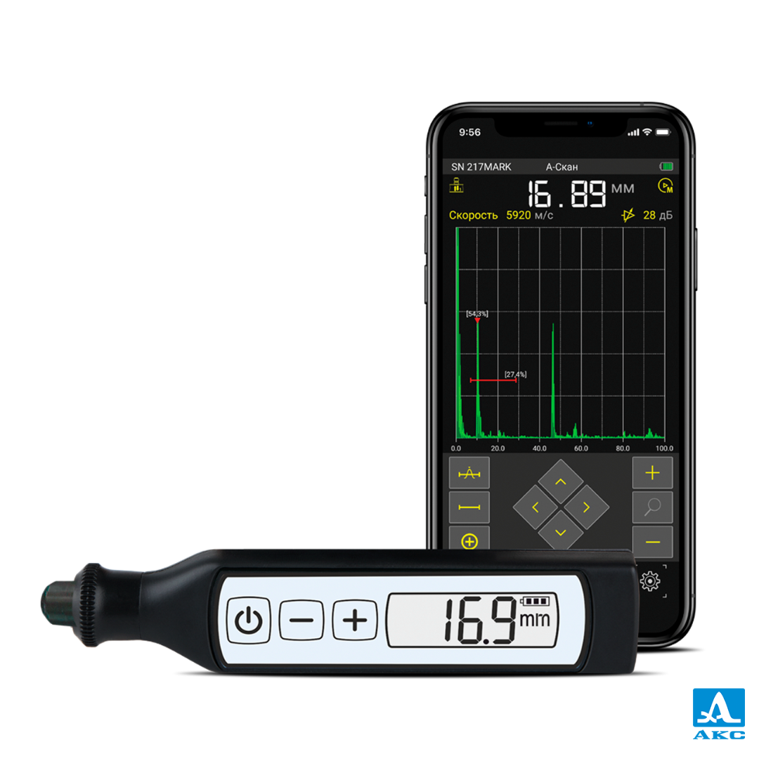- Встроенный Bluetooth модуль для связи и отображения в режиме реального времени (онлайн–толщиномер) цифрового результата измерений и А-Скана сигнала на экране смартфона или планшета