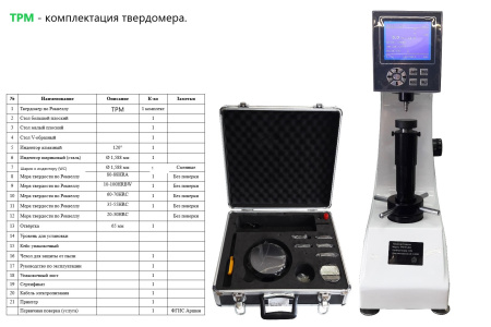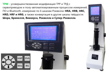 ТРМ – цифровой стационарный твердомер по методу Роквелла: усовершенствованная модификация ТРР и ТРД - моторизированная модель с сервоприводом и полу-автоматизированным процессом измерений (условная расшифровка Твердомер Роквелла Моторизованный). Помимо т. н. "прямого" измерения твёрдости по методу Роквелла путём непосредственного нагружения (терминология по ГОСТ 23677-79), прибор также позволяет измеренные результаты по шкалам Роквелла "переводить/конвертировать/пересчитывать" в шкалы Шора, Бринелля, Виккерса, Роквелла и Супер-Роквелла - т. н. "косвенное" определение твёрдости, корреляция по стандарту ASTM E-140. Твердомеры ТРМ имеют в своём составе встроенное программное обеспечение - предназначено для управления процессом испытаний, выполнения функциональных задач, хранения, статистической обработки и вывода результатов измерений.