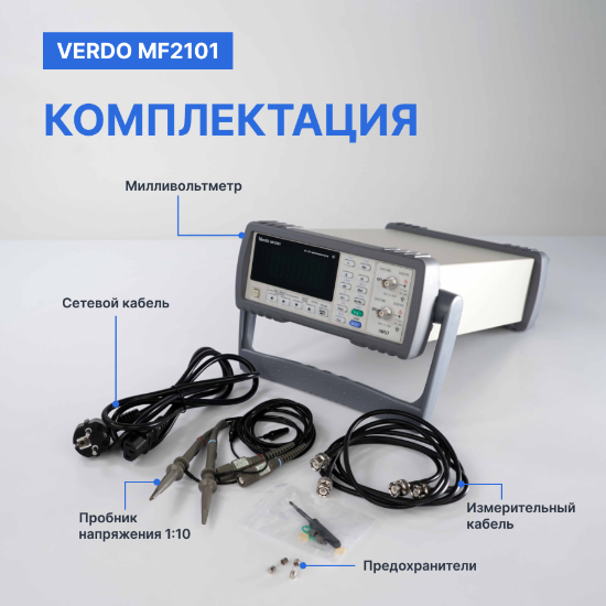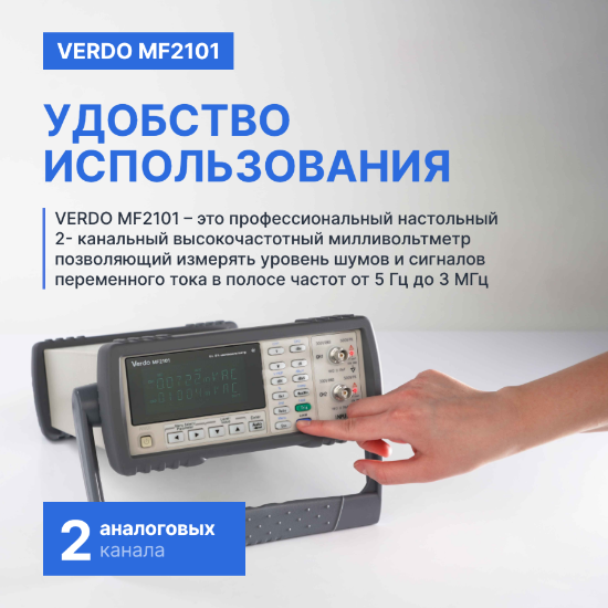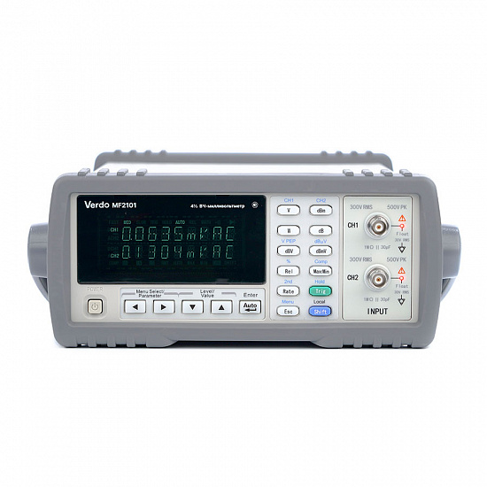 Настольный цифровой 2-канальный высокочастотный милливольтметр VERDO MF2101 позволяет измерить уровень в вольтах и мощность в ваттах переменного напряжения в полосе частот от 5 Гц до 3 МГц. ВЧ-милливольтметр имеет возможность измерений сигналов с плавающим потенциалом. Функция установки импеданса позволяет измерять мощность в дБм различных источников сигнала. Высокая стабильность и скорость измерения делает VERDO MF2101 отличным выбором для метролога, разработчика электронных систем и устройств электропитания.